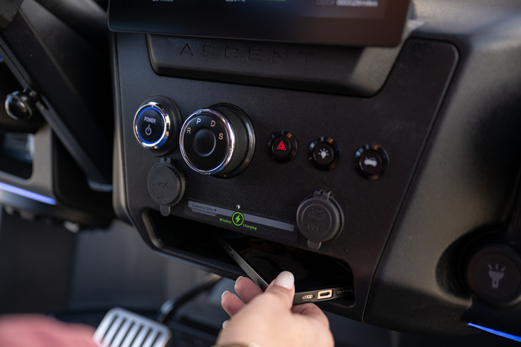 Redefining the silhouette with aggressive contours, industry-first color matched mirrors with LED logo projection, illuminated rocker panels, and a front lockable cargo Frunk, make the Ascent unmistakable before you’ve even climbed in. This is a vehicle to be noticed in.